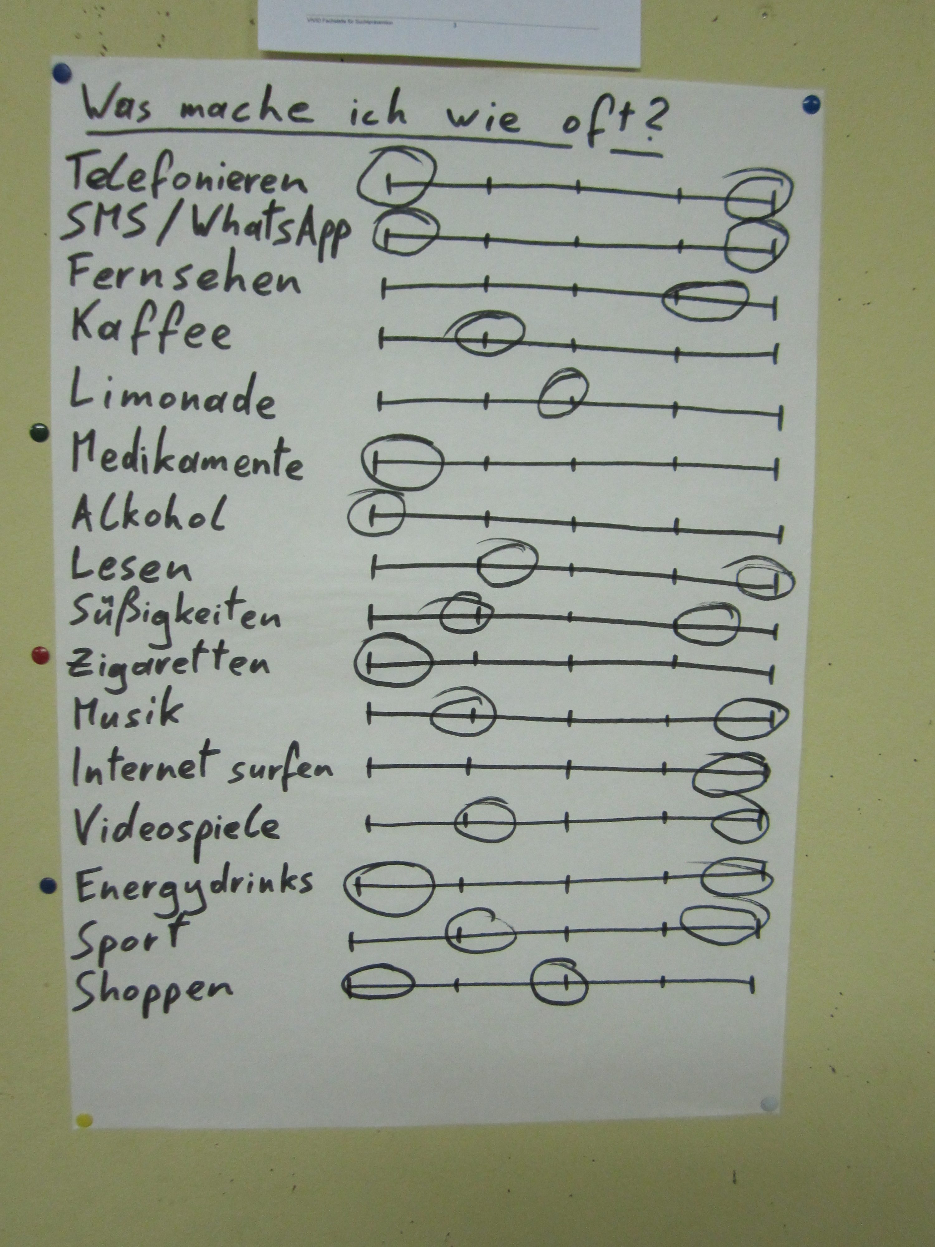 Als Zweites überlegten sich die GuSp, wie oft sie innerhalb einer Woche irgendetwas freiwillig tun bzw. konsumieren und notierten das in ihrem anonymen „Konsumprofil“. Im Vergleich zeigte sich, dass manche Dinge sehr stark polarisieren und von einigen GuSp fast jeden Tag gemacht werden, von anderen jedoch sehr selten.